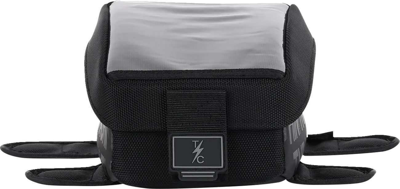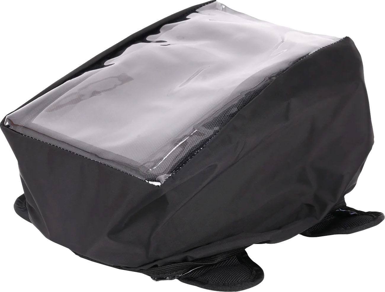 Perfect tank bag for holding essentials such as phones, cameras, and accessories, Constructed from 1680 D ballistic nylon and PU rubber material with structure, 3.5 liter capacity, Magnets attach to a wide range of steel gas tanks, Touchscreen compatible clear cellphone pocket, One interior zipper pocket, Elastic straps on interior base keep goods secure, Included rain cover allows for cellphone visibility, Supplied with clear protective stickers for mounting locations, Structured lid with hook-and-loop closure